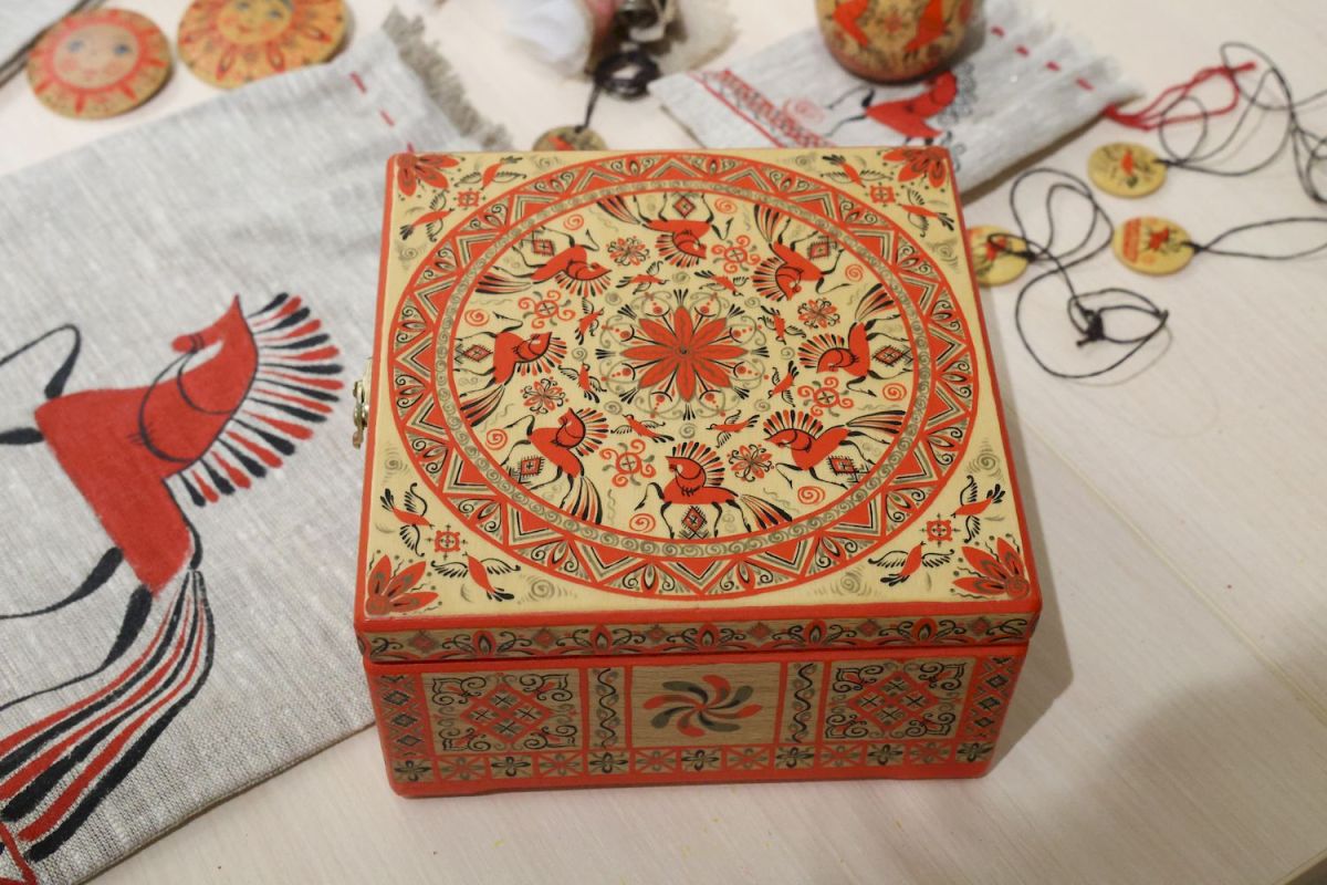 – Это сундук моих друзей, найденный ими на чердаке старого дома. Деревянный, обитый железом, большой. Сколько ему лет, неизвестно. Неизвестно и то, фабричного он производства или его делал какой-то мастер. Когда мои друзья предложили мне его расписать, я даже не знала, что ответить: никогда не работала с такими крупными предметами. Но согласилась: новое притягательно, к тому же я рисовала по металлу необычными для меня красками – эмалевыми. Использовала в росписи традиционные мезенские цвета – красный, чёрный – и античное золото, а фон сделала бежевым, под цвет дерева. Мой рисунок, уже говорила, традиционным назвать нельзя, в данном случае это и не так важно. Важен смысл, который я вложила в него. В мезенской росписи есть, например, элемент «Бёрдо», представляющий собой решётку из клеток (от двух до четырёх) в один или два ряда и названный так по сходству с одноимённой частью ткацкого станка. Он символизирует «плетение» судьбы человека на небесах. Этот элемент называют ещё «Окно желаний»: считается, что через него человек может, обратившись к высшим силам, изменить свою судьбу. Правда, как относиться к этим утверждениям, каждый решает сам. Или, например, у меня было панно «Рыба-мезень, исполняющая желания», тоже богатое различными символами. Одна знакомая сказала: «у меня столько желаний, столько желаний» – и моя рыба «уплыла» к ней. Потом мы как-то встретились, и она сообщила: знаешь, рыба работает. Но работает в первую очередь сам человек – со своими мыслями, которые имеют свойство материализоваться, со своими желаниями – и прикладывает усилия для того, чтобы они осуществились. Если говорить о самой росписи, её энергетика безусловна.