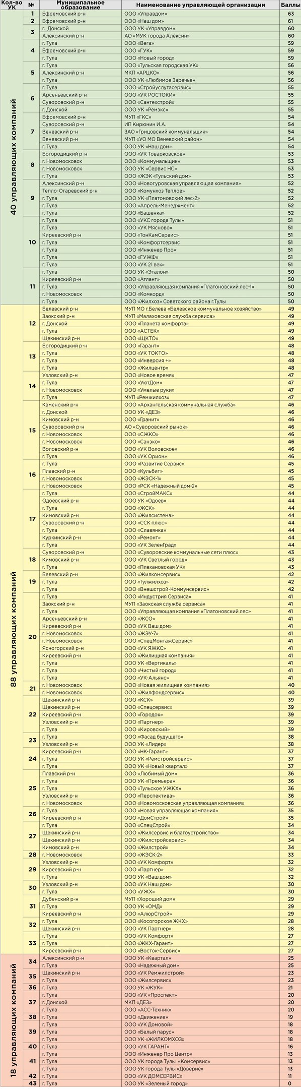 Худшие показатели - у тульских ООО "УК ДОМСЕРВИС" (11) и ООО УК "Зеленый город" (0).
