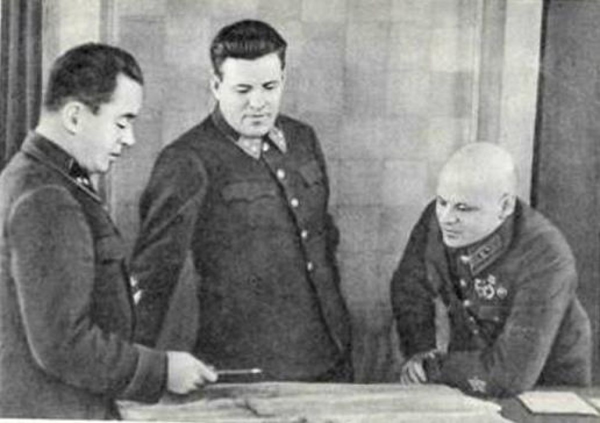 В штабе Московской зоны обороны. Слева направо: начальник штаба генерал-майор А. И. Кудряшов, командующий генерал-лейтенант П. А. Артемьев, дивизионный комиссар К. Ф. Телегин