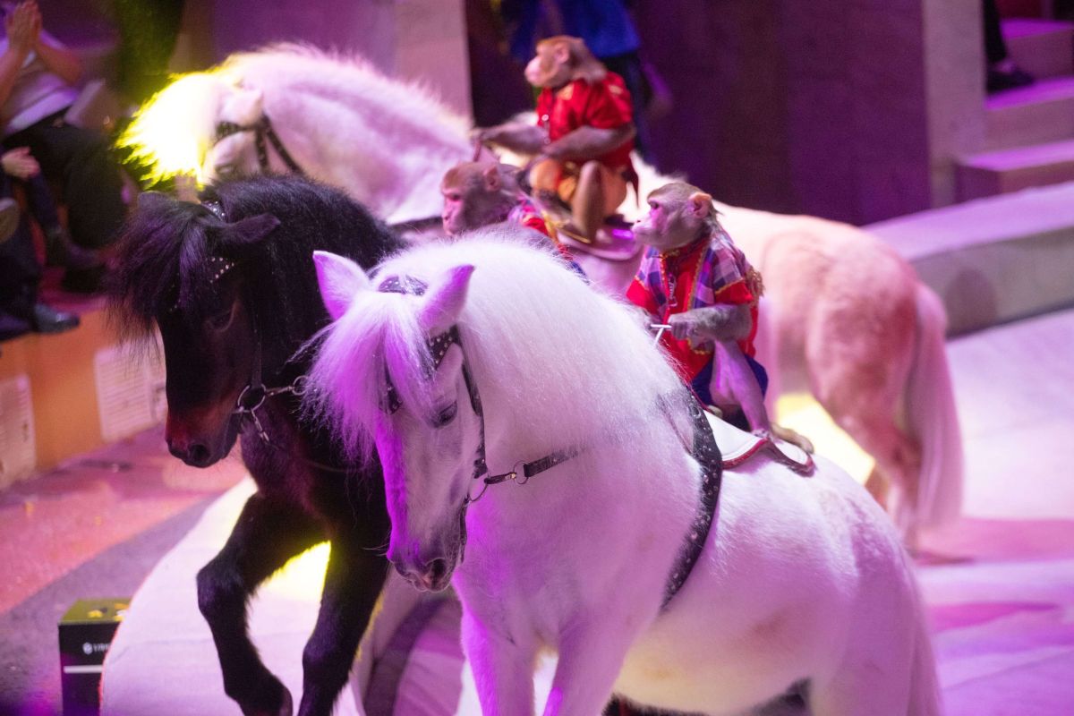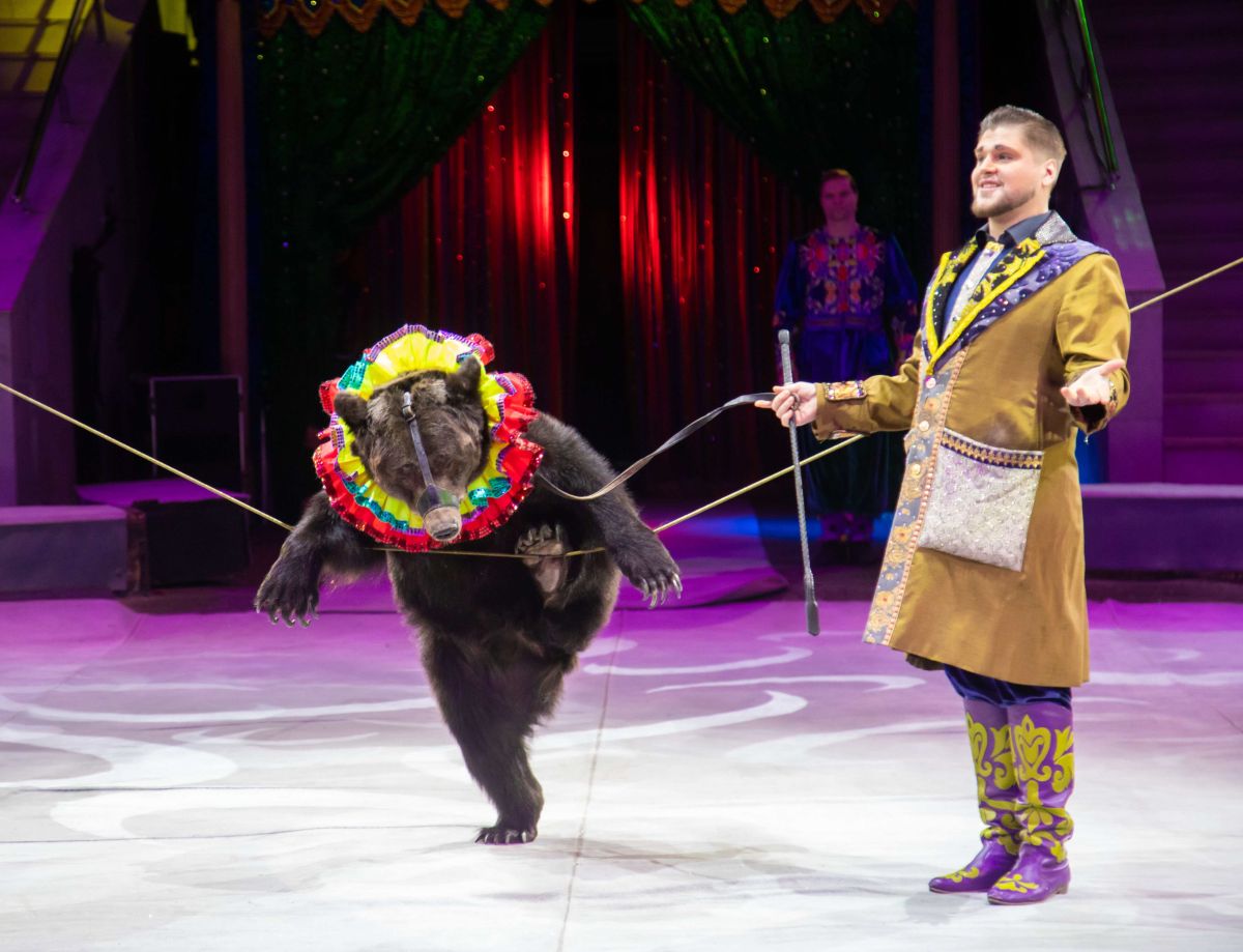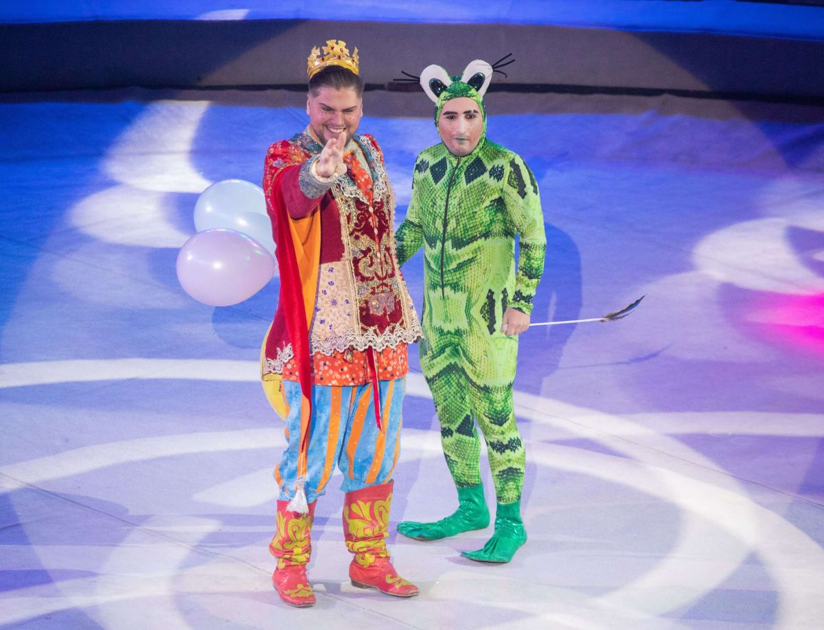 Начинается действо с рождественской ярмарки - на арену высыпают скоморохи и русские барыни в кокошниках. Какая же ярмарка без медведей? А вот и косолапые - пляшут, кувыркаются, гоняют на самокате и даже балансируют на канате!