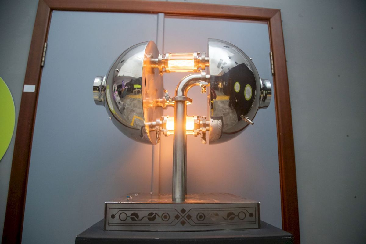 А вот слухач: Циолковский оглох в 10 лет. Как он сам потом написал, «я вообще отупел», но – начал заниматься в мастерской и сделал токарный станок, а потом ещё самоходную машину. Это было в Вятке. К сожалению, эта машина, преобразовывающая одну энергию в другую, до нас не дошла. Но я заказала подобную в Китае. Когда она придёт, мы её соберём и будем запускать в работу. Точнее, это будет делать тот, кому достанется карточка с информацией об этой машине. «Достать» слухач оказалось сложнее всего. Никто в Туле не брался его изготовить – сварить из жести. Сделал один из новомосковских мастеров.