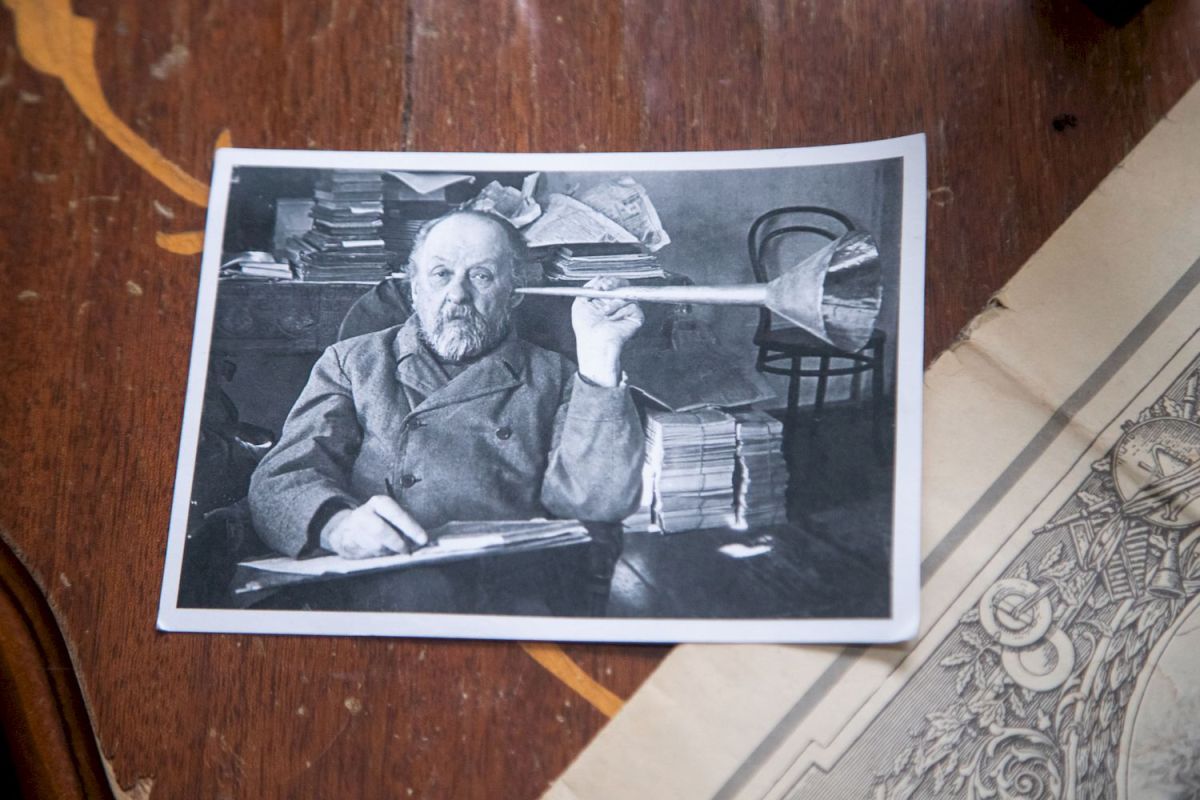 – Это результат воплощения идеи о создании кабинета учёного, изучающего космос, – кабинет Константина Эдуардовича Циолковского. Мы пытались воссоздать интерьер, близкий интерьеру кабинета в доме-музее Циолковского в Калуге. Долго не могли найти зеркало и керосиновую лампу, похожие на те, которыми для освещения пользовался учёный. В конце концов отыскали, причём один в один. Мы много атрибутов приобрели, чтобы воссоздать не только вид, но и сам дух кабинета Константина Эдуардовича. Вот журнал «Огонёк», правда, у нас он один – у Циолковского на столе целая подшивка. Вот рукописи его, вот «рука маркизы» – прищепка такая.