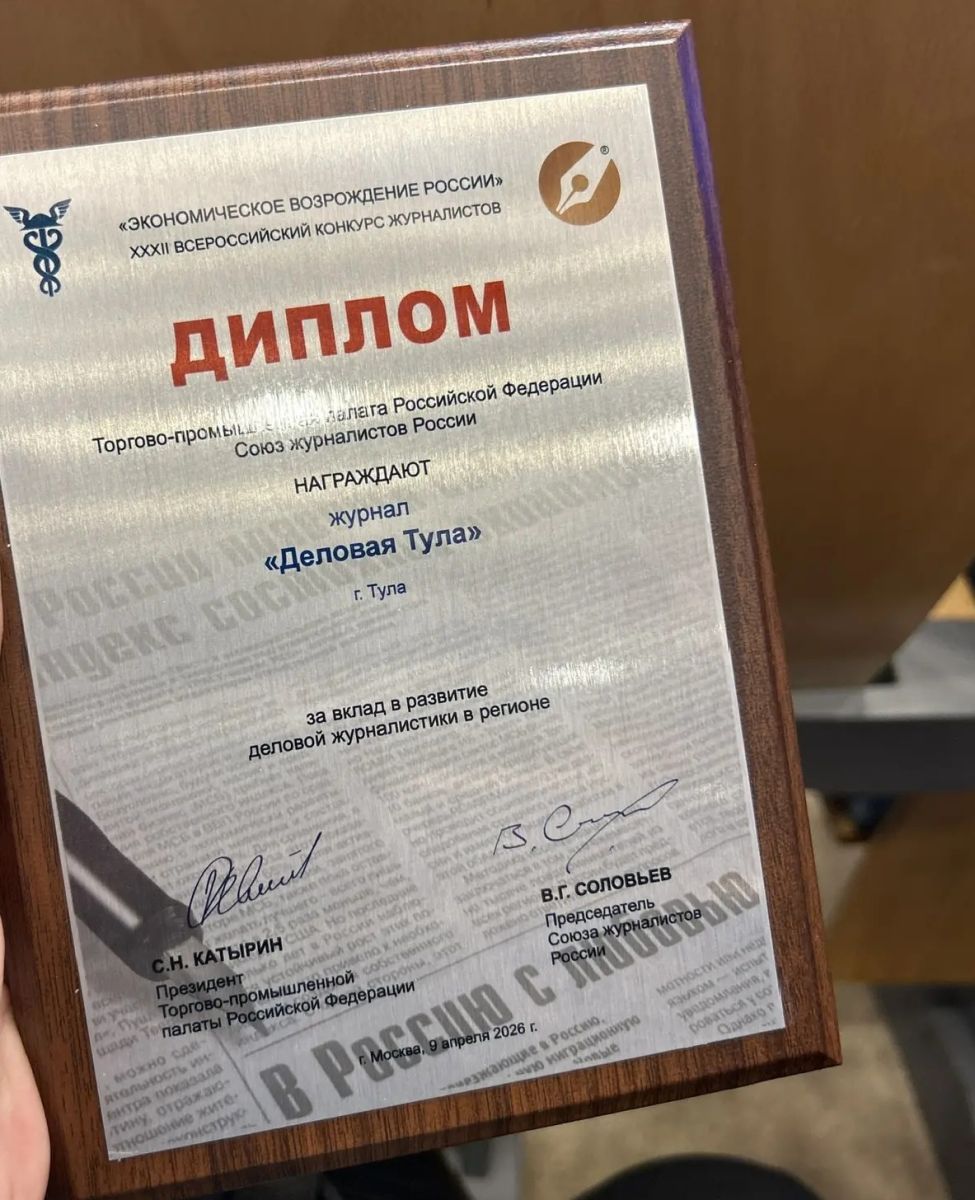 Журнал «Деловая Тула» награжден дипломом ТПП РФ и Союза журналистов России