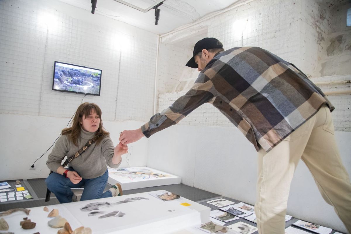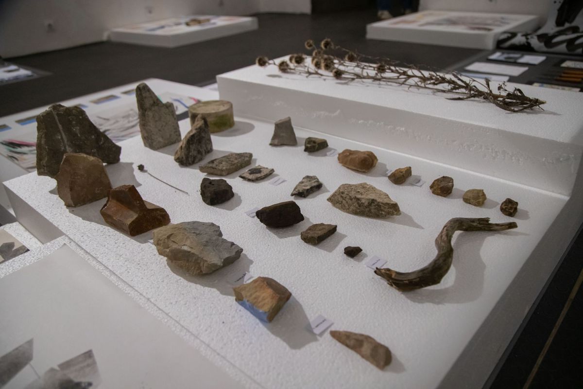 Когда приехали на место и начали работать, поняли, что не сможем показать глубину темы, открывшуюся в результате исследования, лишь с помощью живописи и графики. Тем более что мы попытались посмотреть на чупаевский камень с разных точек зрения, в том числе – с точки зрения, скажем так, его взаимоотношений с человеком. Мы поняли, что нам предстоит рассказать историю о камне и о людях, чьи жизни с ним связаны, не только с помощью рисунка, чёрно-белого или цветного, – нам понадобились фотографии, архивные документы, фрагменты камней… Мы подключили к своему исследованию археологию, и понимание смысла чупаевского камня, его значения для жизни людей постарались выразить в месте размещения экспозиции – на полу. Она выглядит в какой-то степени как археологический раскоп, где, если не смотреть под ноги, можно упустить что-то важное. У нас и входов в этот «карьер», как вы обратили внимание, два, что тоже имеет свой смысл.
